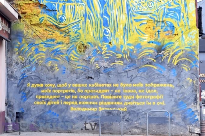 «Я дуже хочу, щоб у ваших кабінетах не було моїх зображень, моїх портретів, бо президент – не ікона, не ідол, президент – це не портрет. Повісьте туди фотографії своїх дітей і перед кожним рішенням дивіться їм в очі», – написані на муралі слова президента України Володимира Зеленського.