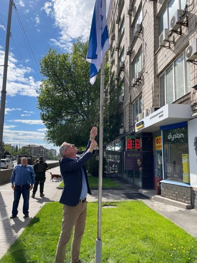 «Посол Ізраїлю в Україні Михайло Бродський підняв ізраїльський прапор біля будівлі посольства Ізраїлю в Україні у Києві», – йдеться у повідомленні.
