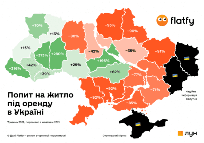 Зазначимо, що за даними Flatfy, найчастіше квартири шукають у Тернопільській області – приріст запитів становить 373% у порівнянні з 2021 роком. На Закарпатті попит зріс на 316%, у Хмельницькій – на 280%, у Черкаській – на 196%. На Львівщині попит зріс на 15%.
