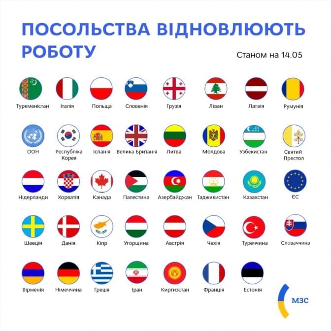 Крім того, 14 травня в Міністерстві закордонних справ зазначили, що 39 іноземних представництв відновили свою роботу у Києві.