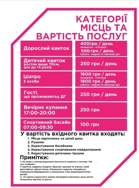 Для дорослих година коштуватиме 120 грн, дві – 200 грн, а повний день – 300 грн. Для дітей до 14 років година обійдеться у 70 грн, дві – 110 грн, а повний день – 180 грн;