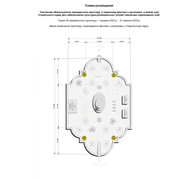 У Львові облаштують громадський простір з відпочинковими місцями та тимчасову сцену у межах алеї Стрийського парку. Простір та сцена діятимуть до кінця жовтня 2022 року на місці фонтану з русалками, який не працює. Йдеться про територію, де поруч у модульних будиночках проживають вимушено переселені українці. Відповідне рішення підтримали на засіданні виконавчого комітету ЛМР сьогодні, 21 червня.