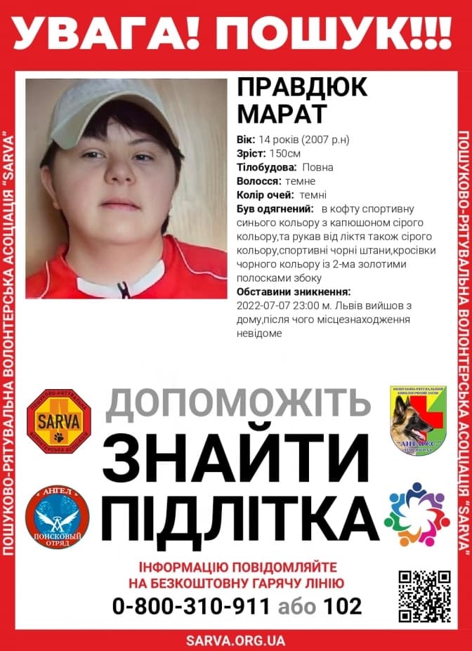 У Львові розшукують 14-річного підлітка Марата Правдюка, який зник ввечері 7 липня. Хлопець вийшов з дому і не повернувся. Про це повідомили у пошуково-рятувальній волонтерській асоціації Sarva.