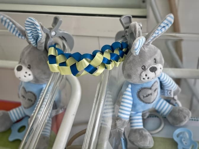 Сьогодні дітям місяць, вони важать майже по три кілограми і їх виписали додому. На згадку про випробування, яке сім’я була змушена пройти, мама сплела косичку з синьо-жовтих стрічок, що символізує переплетені пуповинки. Нею жінка поєднала перші іграшки синів – зайчиків, що їх подарував тато.