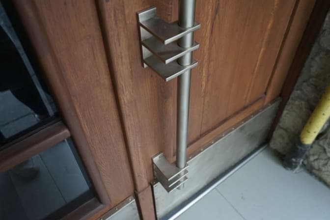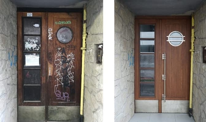 «Деревина цих дубових дверей була дуже «покручена», нам довелося її вирівнювати та замінити до 10% вже непридатного матеріалу. Також ми зафіксували коробку дверей та замінили завіси, які були вщент зношені. Довелося виготовити і нові ручки дверей, яких взагалі не було: хтось їх поцупив чи зняв відносно нещодавно, адже автентичні ми знайшли на фото у Google Maps. І за цим фото виготовили нові», — розповів реставратор Павло Войтович.