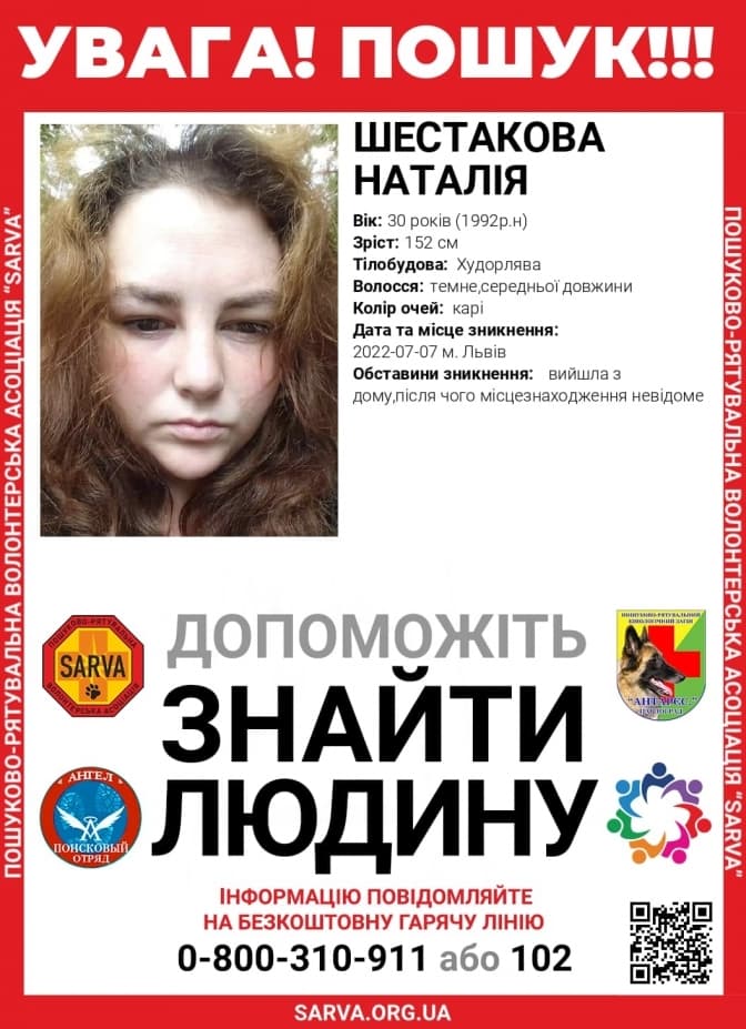 У Львові оголосили про розшук Наталії Шестакової. 30-річна жінка 7 липня вийшла з дому та досі не повернулася. Про це повідомили у пошуково-рятувальній волонтерській асоціації.