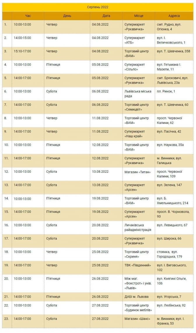 У Львові оприлюднили графік мобільних пунктів збору відпрацьованих люмінісцентних ламп, термометрів і батарейок. Їх можна здати від 4 до 26 серпня.