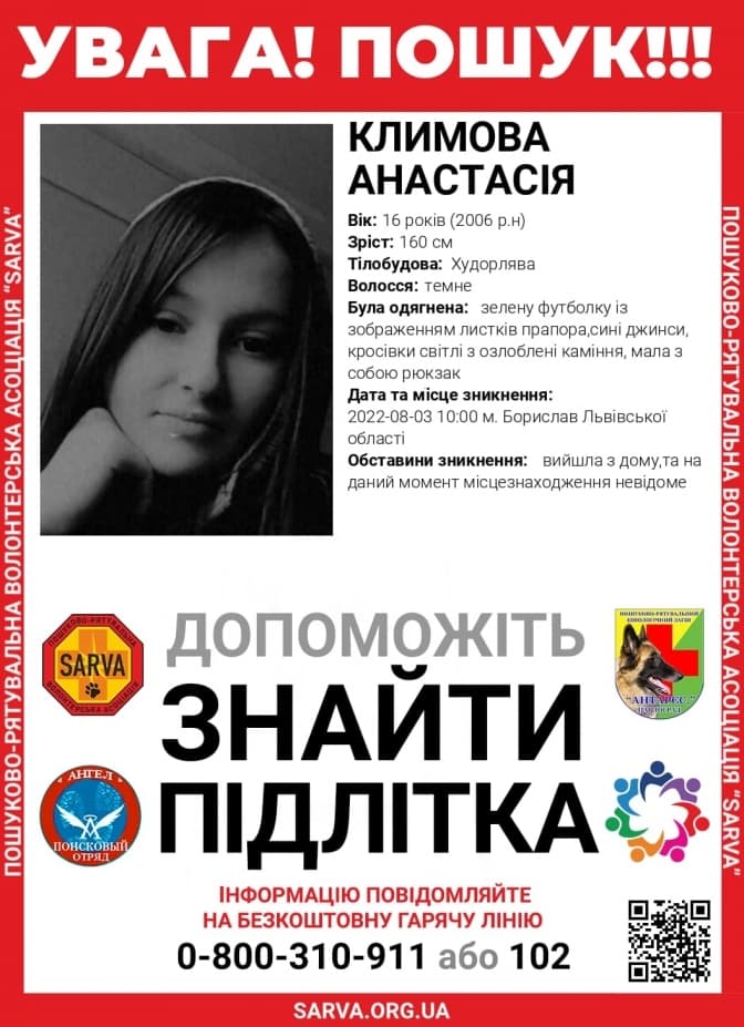На Львівщині оголосили про розшук неповнолітньої дівчини. 3 серпня о 10.00 16-річна дівчина вийшла вийшла з дому та досі не повернулася. Про це повідомили у пошуково-рятувальній волонтерській асоціації.