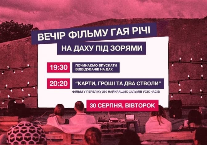 У вівторок львівʼян запрошують переглянути стрічку «Карти, гроші та два стволи, що димлять» британського кінорежисера, сценариста та продюсера Гая Рі. Фільм демонструватимуть українською мовою з англійськими субтитрами. Квитки можна придбати онлайн, у касі, або на вході. Телефон для додаткової інформації: 093 486 16 28.