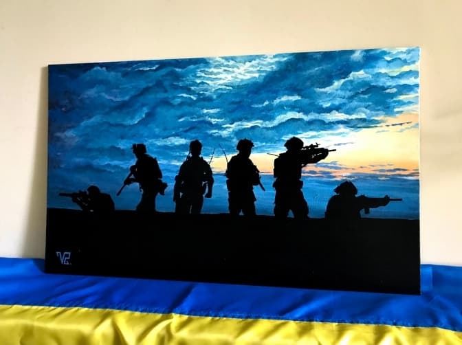 Фантастичний лот – картину, яка намальована з реального фото бійців з розвідки 93-ої окремої механізованої бригади пропонує волонтерка Анна Левчук.