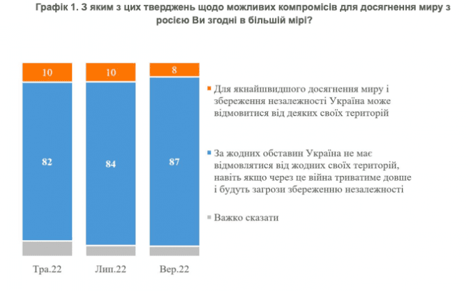 Для 87% опитаних українців жодні територіальні поступки не є припустимим (і цей показник зріс порівняно з липнем на 3 процентних пункти). Лише 8% вважають, що для досягнення миру і збереження незалежності можна відмовитися від деяких територій (і частка таких людей знизилася порівняно з липнем на 2 процентних пункти). Про це свідчать результати опитування Київського міжнародного інституту соціології, проведеного 7-13 вересня.