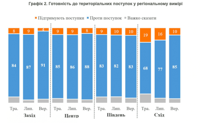У всіх регіонах України абсолютна більшість населення проти будь-яких територіальних поступок. Навіть серед жителів Сходу, який зараз зазнає інтенсивних боїв, 85% проти поступок (готові на поступки – лише 10%), а серед жителів Півдня – 83% проти поступок (готові – лише 10%). У період з травня до липня на Сході з 68% до 77% стало більше тих, хто проти будь-яких поступок, а у вересні цей показник зріс ще до 85%. Зараз фактично немає різниця між поглядами мешканців різних регіонів.