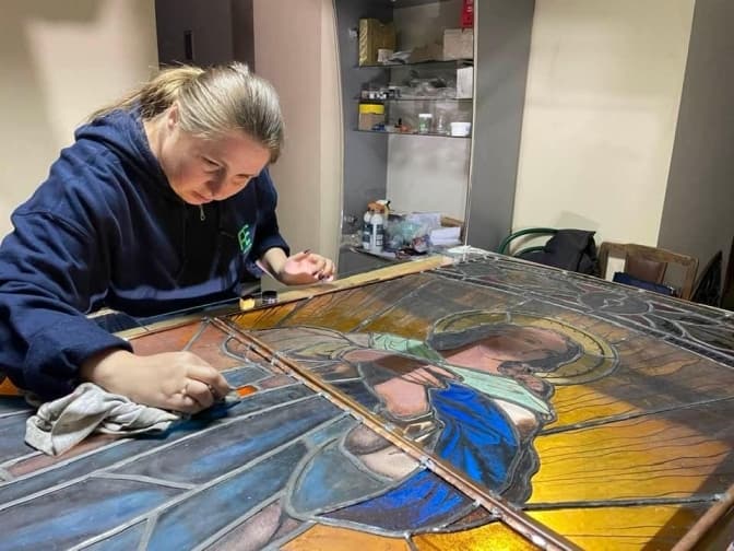 5. Відреставрований 130-річний вітраж повернуть до львівського храму. Це округлий вітраж, який зображує Непорочне Зачаття.