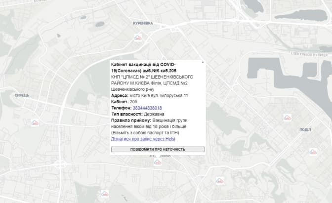 За допомогою спеціальної мапи можна побачити найближчий пункт вакцинації, а також записатися на щеплення через медичну систему Helsi.