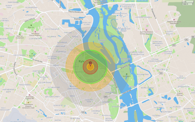 За допомогою сервіса NUKEMAP можна візуалізувати розмір цих зон у разі гіпотетичного ядерного удару по центру Києва. Наслідки удару ракетою «Кинжал» із ядерною боєголовкою (орієнтовна потужність вибуху 25 кілотонн). «Кинжал» наша ППО поки що збивати не може.