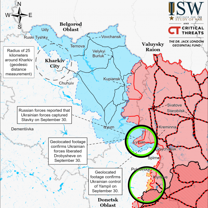 Ситуація на фронті. ЗСУ взяли в оперативне оточення Лиман на Донеччині, про це заявив уповноважений з питань осіб, зниклих безвісти за особливих обставин Олег Котенко. За даними аналітиків, що ведуть карту бойових дій DeepState, українські військові зайняли місто Ямпіль. Як вважають аналітики американського Інституту вивчення війни (ISW), українські війська, ймовірно, повністю оточать або захоплять Лиман протягом наступних 72 годин.