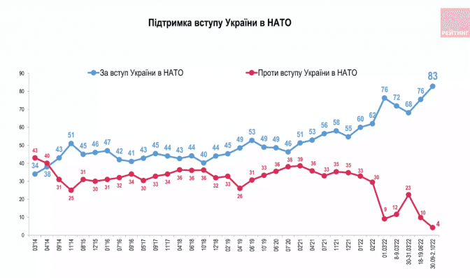 Підтримка вступу українців до НАТО сьогодні – найвища за історію спостережень. Так, на референдумі цю ініціативу підтримали б 83% опитаних, проти – 4%, не проголосували б 9%. Про це свідчать результати дослідження соціологічної групи «Рейтинг», яке провели 1-2 жовтня 2022 року.