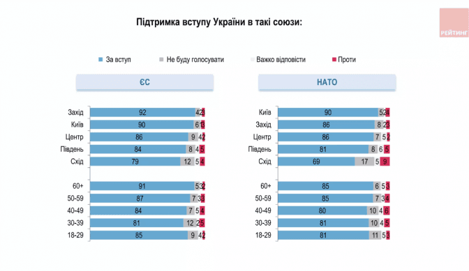 Також 86% опитаних підтримали б вступ України до Євросоюзу у разі проведення референдуму (проти – 3%, не проголосували б – 7%). Підтримка вступу до ЄС одностайна серед представників усіх макрорегіонів та вікових груп.