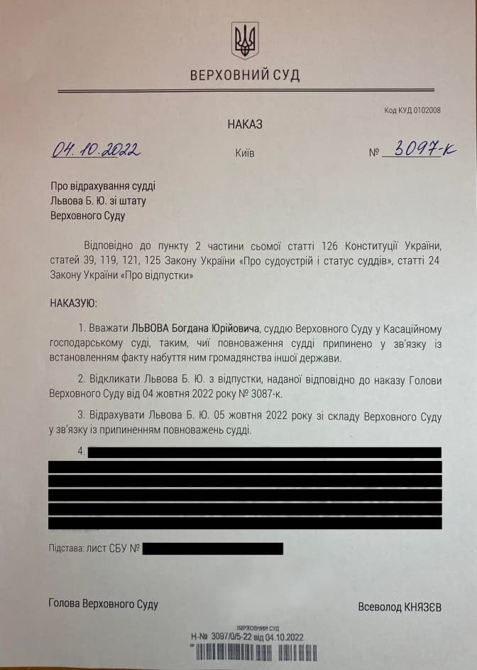 Голова Верховного Суду Всеволод Князєв відрахував суддю Богдана Львова, у якого знайшли російський паспорт.
