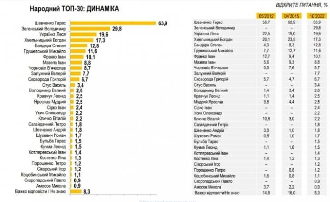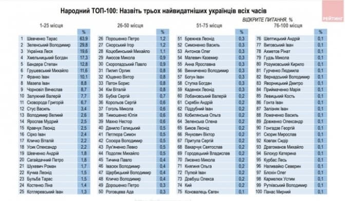 В межах проекту «Народний ТОП» соціологи продовжили дослідження видатних українців усіх часів. За допомогою відкритого питання респонденти, не отримуючи жодних списків чи підказок, називали імена відомих особистостей, котрих вони вважають достойними цього рейтингу.