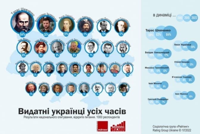 Відтак, лідером рейтингу «Народний ТОП» вчергове став Тарас Шевченко (63,9%). До першої п’ятірки найвидатніших українців також увійшли Володимир Зеленський (29,8%), Леся Українка (19,6%), Богдан Хмельницький (17,3%) та Степан Бандера (12,8%).