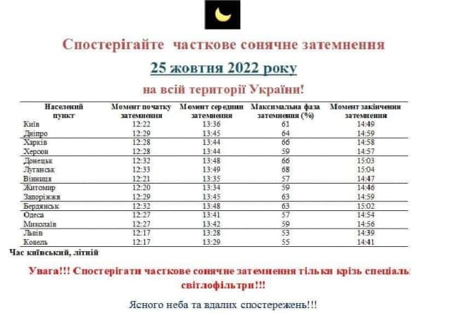 Часткове сонячне затемнення можна буде спостерігати у першій половині дня у вівторок, 25 жовтня. У Львові Місяць закриє диск Сонця на 53%. Початок затемнення о 12:17.