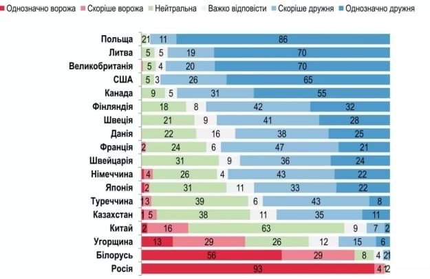 Угорщина натомість перейшла з нейтральних у стан ворожих – такою її вважають 41%, нейтральною – 26%, дружньою – 21%. білорусь (85%) та росія (97%) для українців – це абсолютно ворожі країни.
