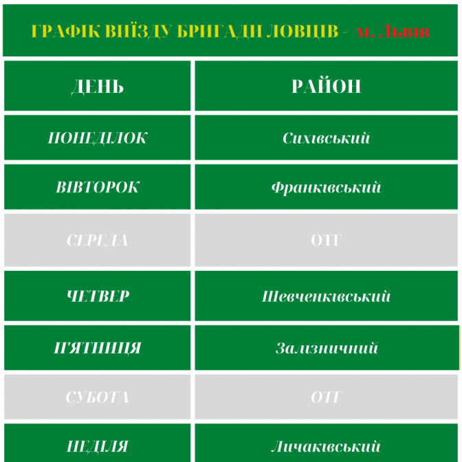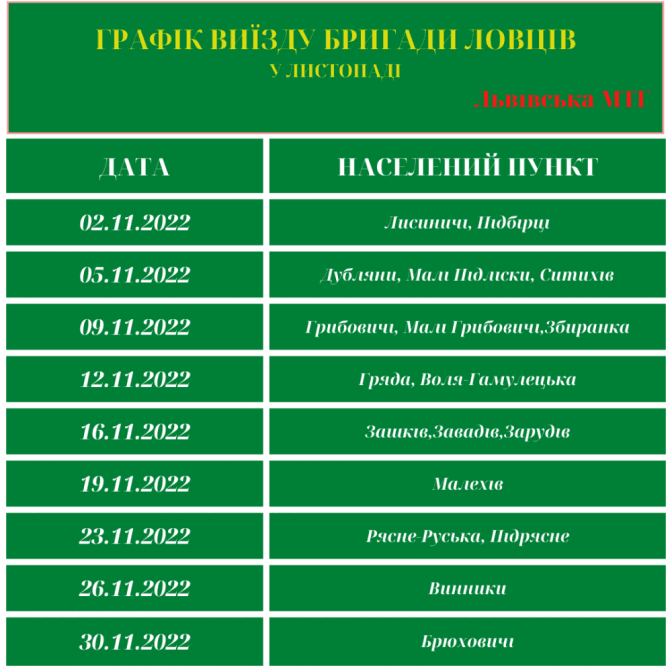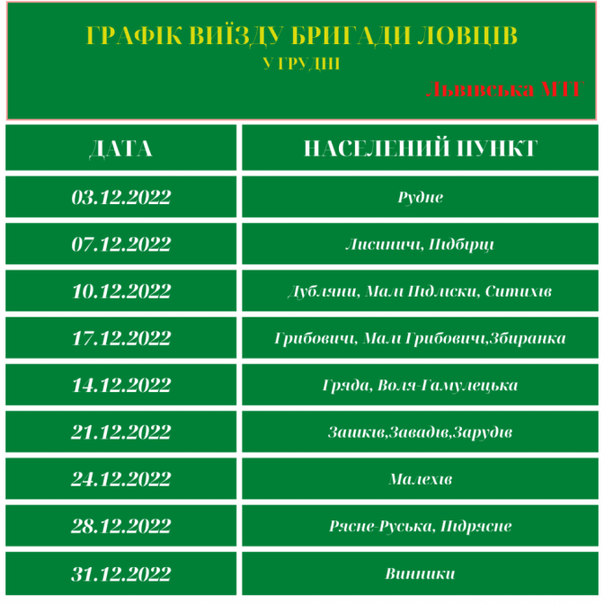 ЛКП «Лев» підготувало графік виїзду бригади ловців на територію Львівської МТГ у листопаді та грудні 2022 року. Бригада ловців виїжджає у населені пункти ОТГ щосереди та щосуботи, в інші дні тижня – у райони Львова.