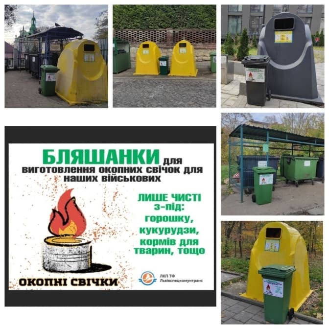 У Львові комунальне підприємство «Львівспецкомунтранс» розпочало збір бляшанок для виготовлення окопних свічок для військових. Вже розмістили 10 резервуарів для збору у Личаківському районі міста. Мешканців закликають долучитись до такої акції.
