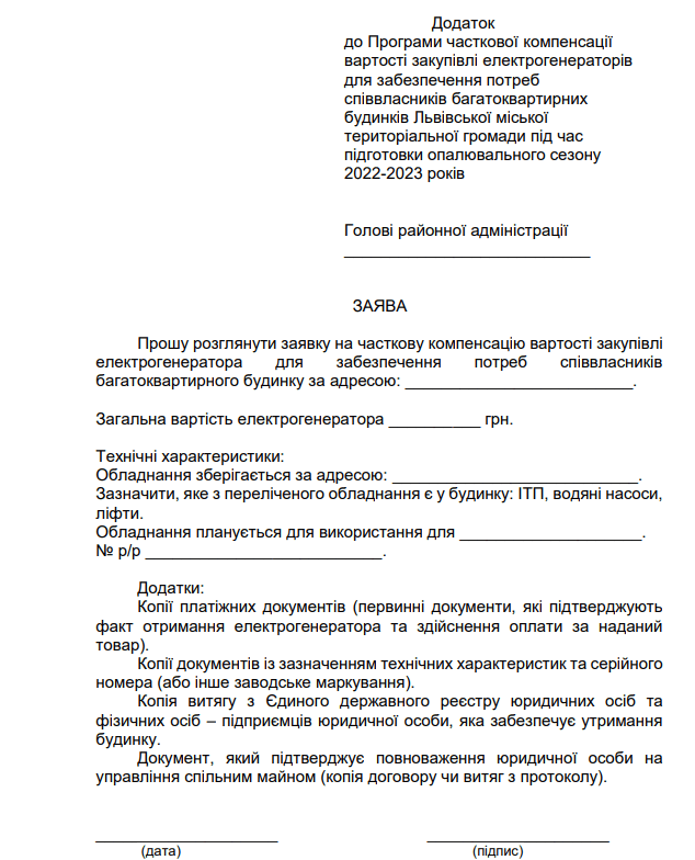 «Уже від сьогодні Центри надання адміністративних послуг готові приймати заяви мешканців з підверджуючими документами про придбання генератора. Форма цієї заяви є додатком до прийнятого рішення. Перш ща все, мешканцям треба ініціювати збори ОСББ чи звернутися до керівника управляючої компанії та погодити придбання генератора. Після придбання та привезення генератора уповноважена особа від мешканців (приміром, голова ОСББ чи керівник управляючої компанії) подає відповідну заяву з оформленими документами, що підтверджують купівлю (накладною, оплаченим рахунком, випискою з банку). Районні адміністрації опрацьовують ці заявки, за потреби можуть провести візуальну перевірку, тобто переконатися, що генератор є, він новий і працює та відшкодовують 50% вартості», – каже він.
