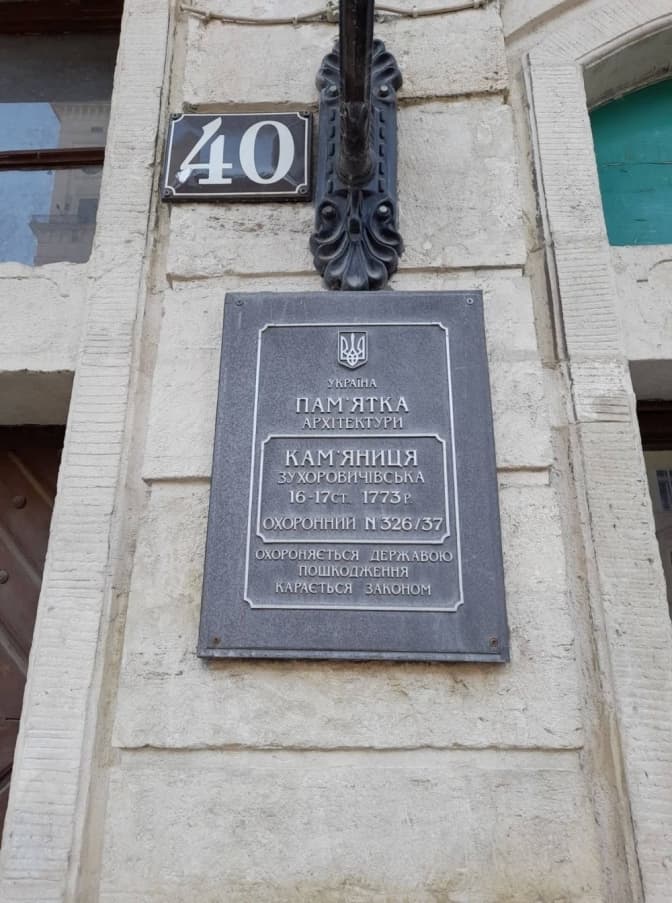 Будинок № 40 на пл. Ринок – Кам'яниця Зухоровичівська – споруджений у XVII ст. У другій половині XVIII ст. належав монастирю св. Онуфрія. У 1773 році на замовлення члена Ставропігії королівського поштмейстера Антона Дейми будівля була перебудована і прикрашена фігурами атлантів.