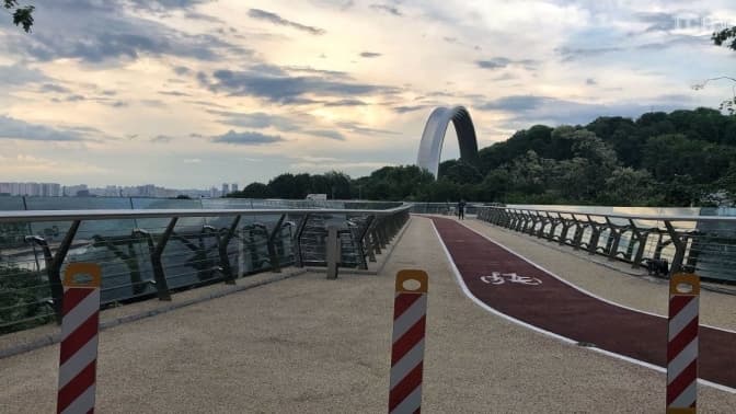 На вцілілому від російської атаки велосипедно-пішохідному мосту в Києві замінюють скло.