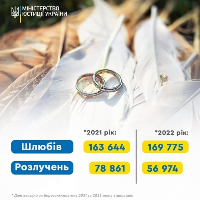 Зокрема, протягом березня-жовтня шлюб уклали 169 775 пар молодят, що на 6 131 більше, ніж за аналогічний період 2021 року. За даними Міністерства, кількість розлучень за вісім місяців склала 56 974. Це майже на 22 тисячі менше, ніж за аналогічний період минулого року.