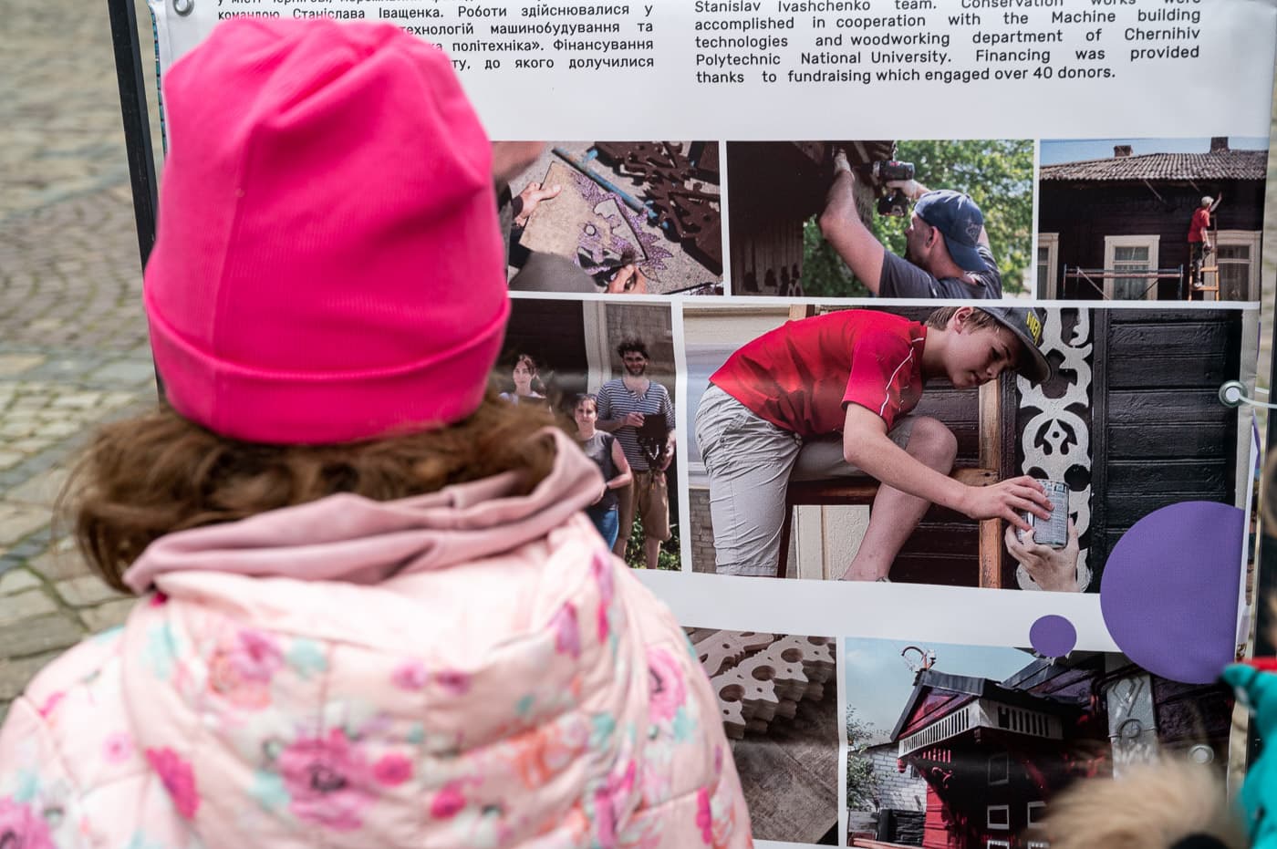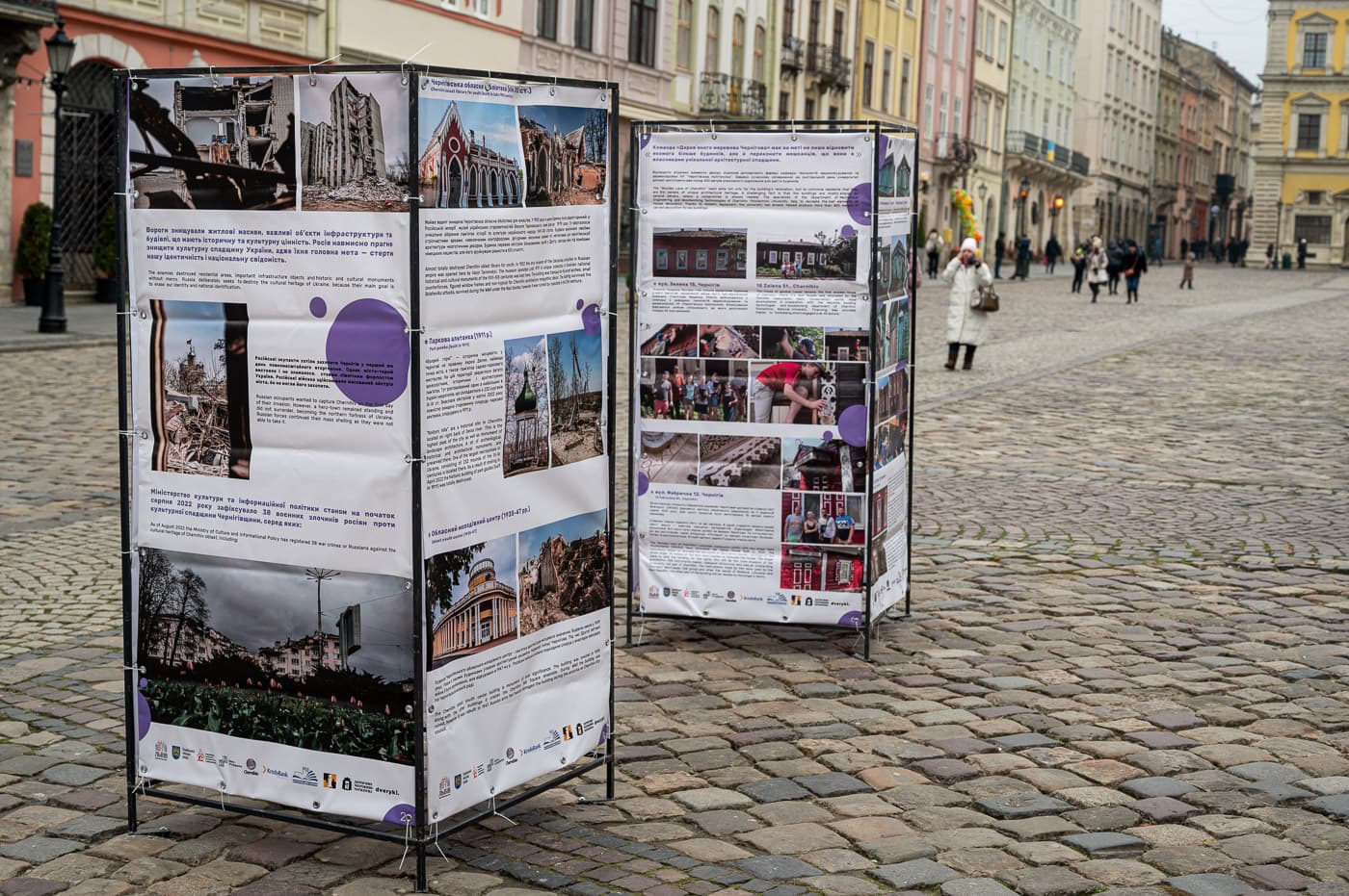 У Львові на пл. Ринок відкрили виставку «Чернігів. Спадщина під обстрілами». Так організатори хочуть привернути увагу до культурної спадщини Чернігова, розповісти про ініціативи, які діють в місті, та показати, яких втрат воно зазнало під час повномасштабного вторгнення росіян.