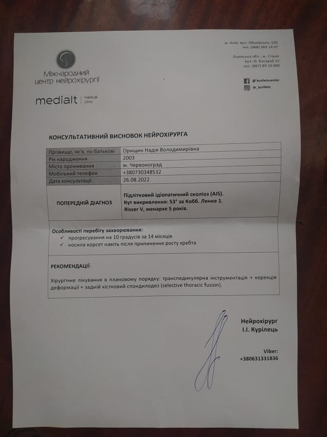Львів’ян закликають долучитися до допомоги 19-річній Надії Орищин з підлітковим ідіопатичним сколіозом. Вона навчається в Луцьку, але родом з Червонограда на Львівщині. Такий діагноз їй поставили у 2019 році.