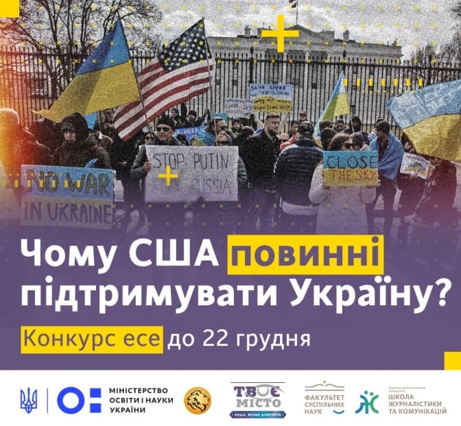 1 грудня розпочався конкурс на найкраще есе на тему «Чому США повинні підтримувати Україну?». Він триватиме до 2 січня 2023 року. Участь у конкурсі можуть взяти українці від 16 років і отримати за це грошову винагороду.