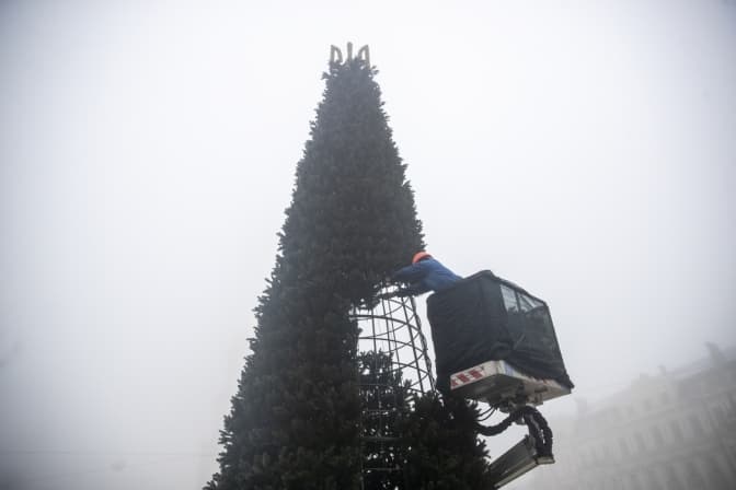 На Софійській площі в Києві вже встановили та розпочинають прикрашати символічну ялинку незламності. Про це повідомили в КМДА.