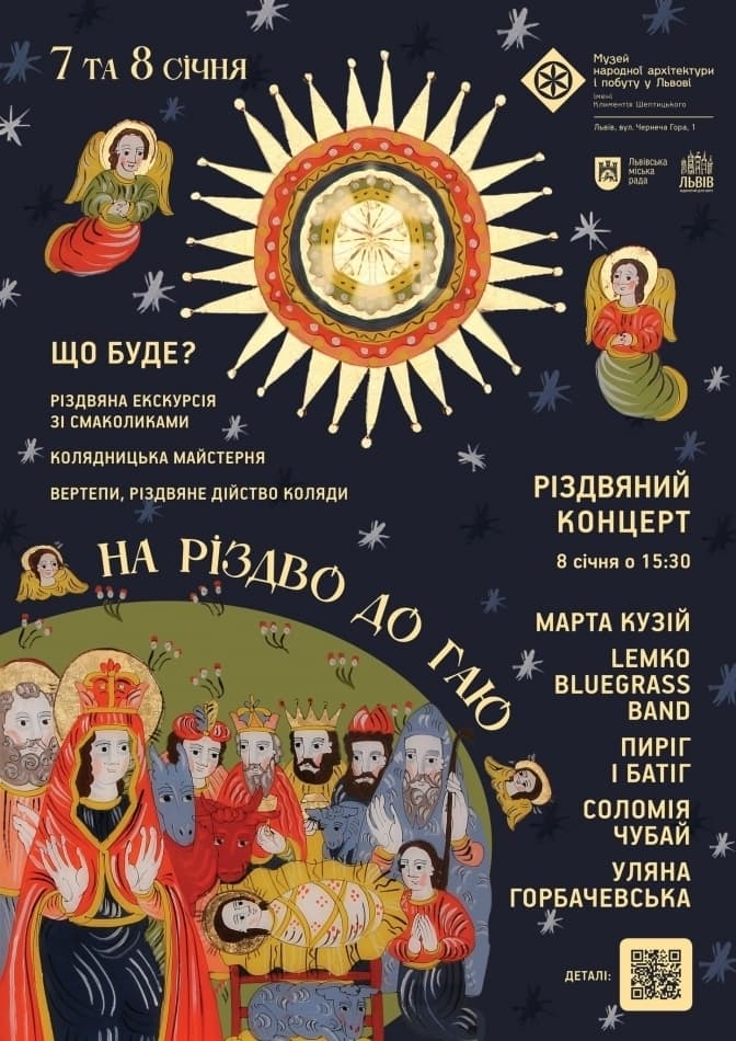 У Шевченківському Гаю відвідувачі довідаються, як святкували Різдво наші пращури та спробують традиційні святкові смаколики. Долучитися можна за попередньою реєстрацією за посиланням. З 13:00 до 16:00 організатори обіцяють вертепи та колядки у стодолі зі села Либохори. З 15:00 до 16:00 у колядницькій майстерні відвідувачі заходу дізнаються про особливості святкування Різдвяних свят та заколядують пісень із нового збірника музею.