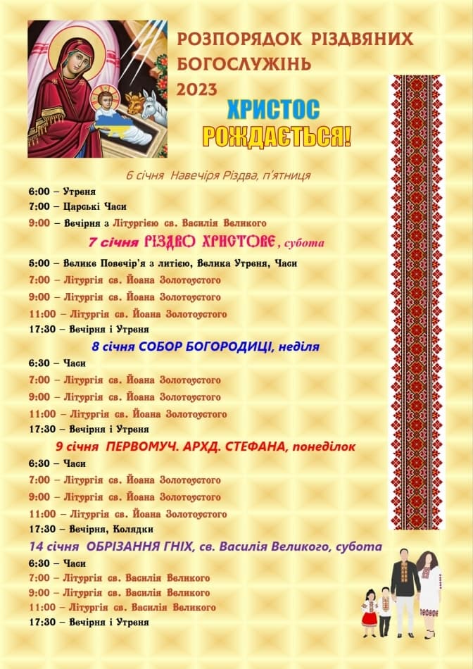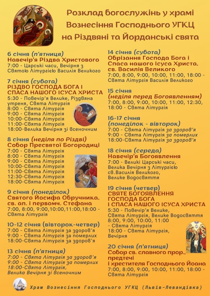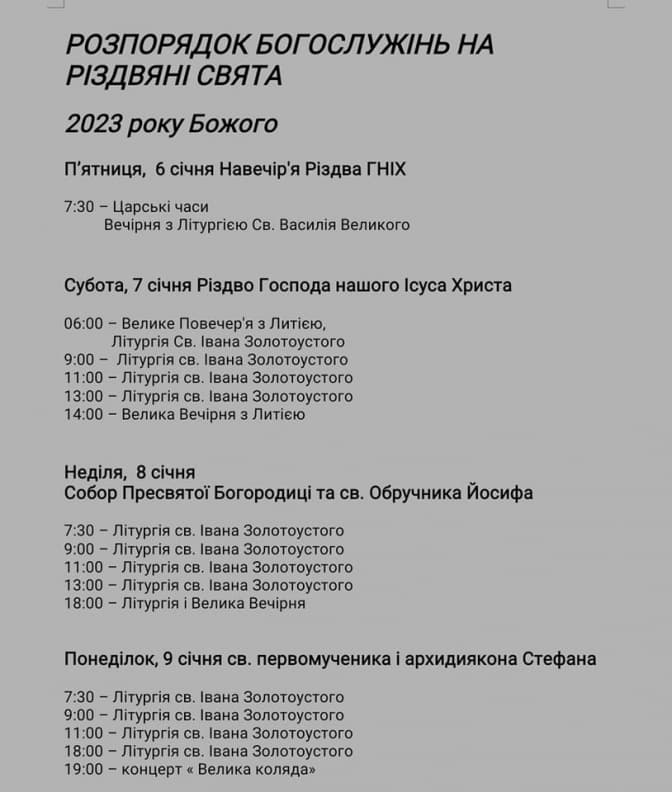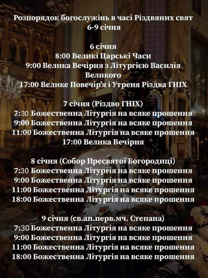 Сьогодні, 7 січня, християни східного обряду святкують Різдво Христове. У катедральних храмах Львова відбудуться Різдвяні Богослужіння та колядування. Початок та завершення всіх урочистих літургій 6 і 7 січня не припадатимуть на комендантську годину – так, аби віряни могли після цього дістатися до своїх домівок. Зокрема, перші літургії починатимуться о 7:00-7:30, а останні увечері – о 17:00 чи 21:30.