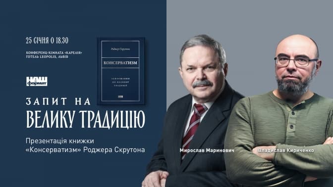У Львові проведуть дискусію «Запит на Велику Традицію. Презентація книжки «Консерватизм» Роджера Скрутона». Захід відбудеться з нагоди виходу першого українського видання класика сучасного британського консерватизму.