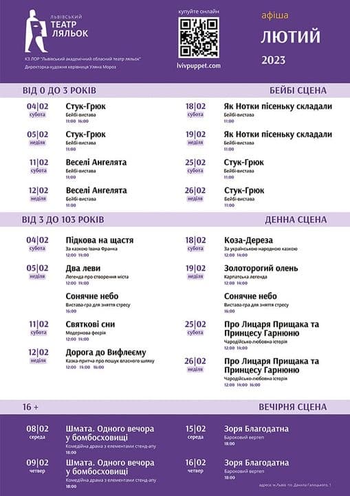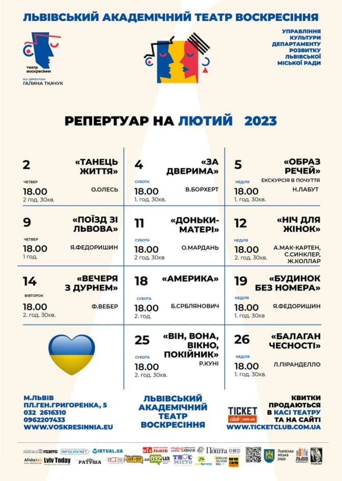У лютому Львівський академічний театр «Воскресіння» покаже глядачам 11 різних вистав зі свого репертуару. Всі вони є абсолютно різними за жанром, тому кожен зможе обрати щось для себе. Квитки на всі вистави можна придбати у касі театру або на сайті.