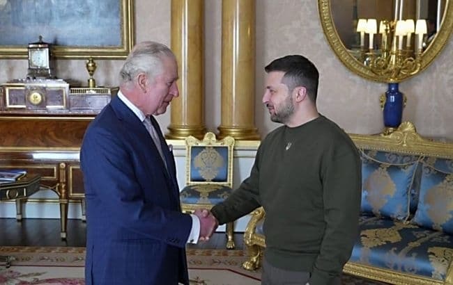 На цю ж тему: Зеленський зустрівся із королем Чарльзом. Це перша зустріч британського монарха із Зеленським. Британські ЗМІ відзначили, що на фотографіях монарх у костюмі, тоді як Зеленський був одягнений у джемпер і штани у військовому стилі;