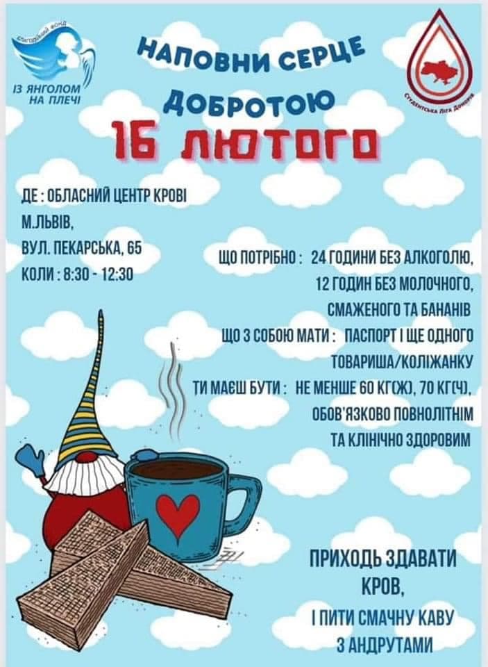 «16 лютого разом із Благодійний фонд «Із янголом на плечі» ми хочемо нагадати про малечу, якій потрібна кров та тромбоцити. Запрошуємо до нашого центру служби крові у Львові здати кров та дізнатися більше про донорство тромбоцитів», – пишуть вони.