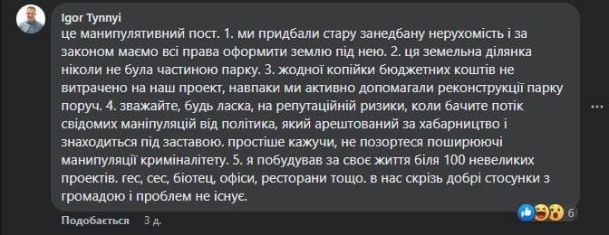 Водночас Ігор Тинний у відповідь зазначив, що ця ділянка не є частиною парку «Наталка» і додав, що на проєкт не витрачали бюджетних коштів і допомагали реконструювати парк поруч.