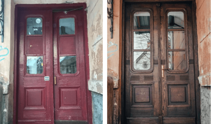 «Тут був втрачений фрагмент притульної планки, автентичні ручки, поріг. Частково засклення брами було втрачено. А ще у дерев’яне полотно невдало врізали кодовий замок. Ми реставрували цю дубову браму близько двох місяців», – каже майстер-реставратор Ігор Вардзаль.