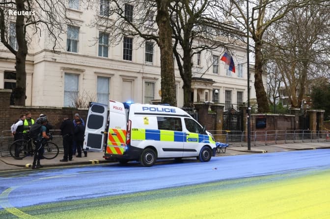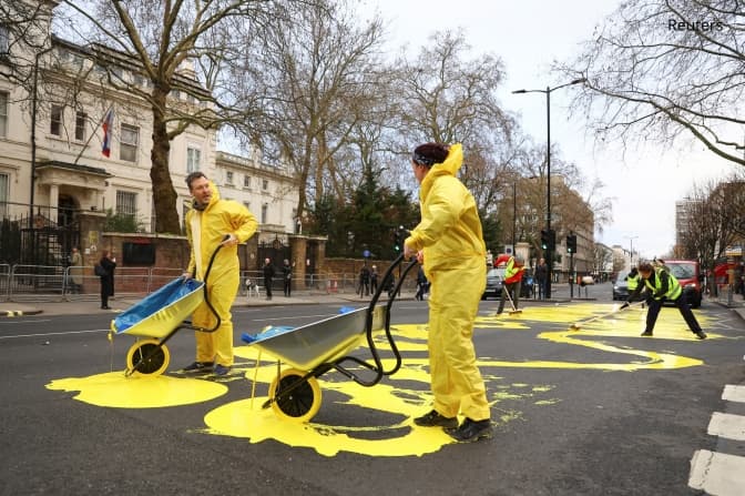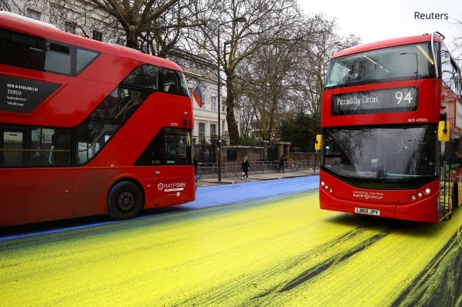 У четвер, 23 лютого, група активістів розфарбувала у синьо-жовті кольори одну із центральних вулиць Лондона на знак протесту проти дій рф. На фотографіях, видно, що вулиця Бейсуотер-роуд, біля посольства росії в Кенсінгтоні залита синьо-жовтими фарбами, а поліція перекрила рух.