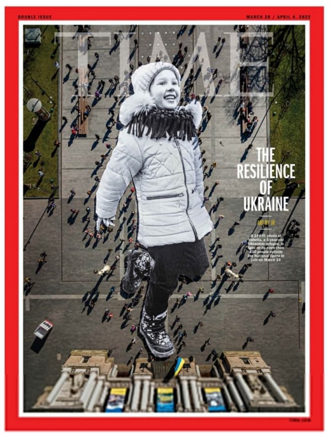 У перші тижні повномасштабної війни в Україні команда JR приїхала до Львова для створення проєкту, що став однією з обкладинок журналу TIME. Тоді понад 100 українців розтягнули у місті величезне полотно з фотографією української дівчинки.