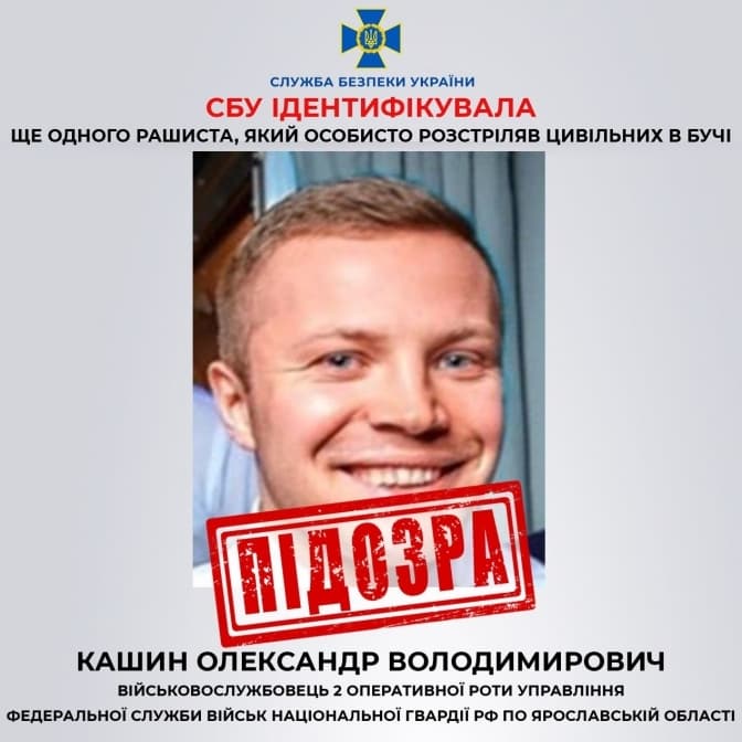 За процесуального керівництва ювенальних прокурорів Київської обласної прокуратури заочно повідомлено про підозру військовослужбовцю 2 оперативної роти Управління Федеральної служби військ Нацгвардії РФ по Ярославській області за фактом жорстокого поводження з цивільним населенням, поєднаному з умисним вбивством (ч. 2 ст. 438, ч. 2 ст. 15, ч. 2 ст. 438 КК України).