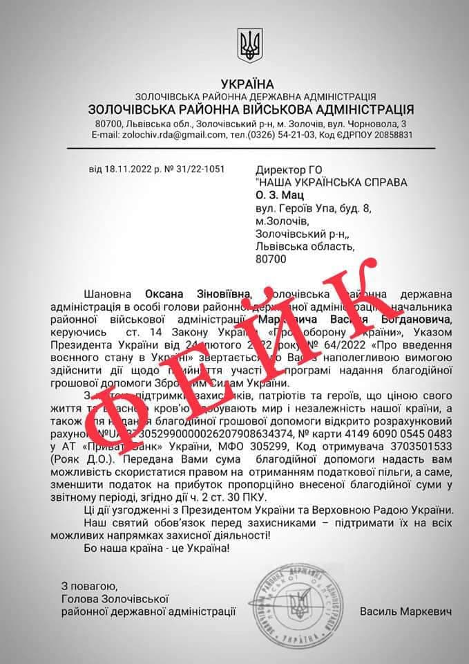 Голова Золочівської РДА Василь Маркевич повідомив, що на адресу установ та організацій Львівської області надходять листи від нібито районних військових адміністрацій з проханням допомоги, а з невідомих номерів телефонують та розсилають повідомлення нібито від імені голів РВА.