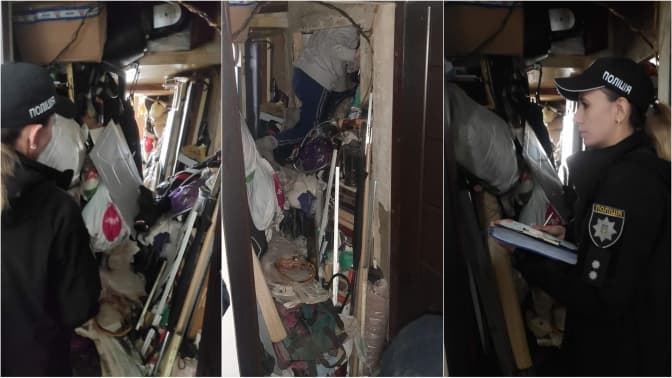 Перевіривши умови проживання, поліцейські виявили занедбану оселю: розкидане сміття, що закривало повністю прохід у квартиру, брудні речі, сморід, таргани, недопалки та відсутність комунікацій.